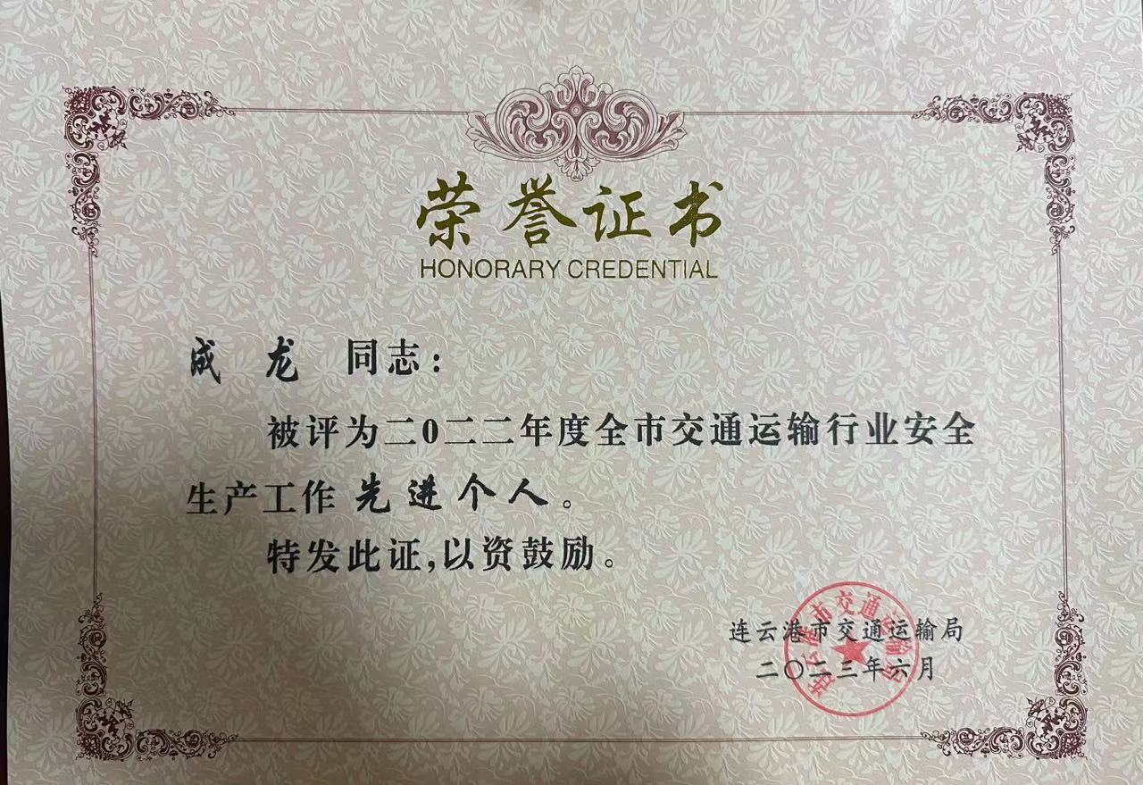日前,《关于表彰2022年度全市交通运输行业安全生产工作先进单位、先进集体和先进个人的通报》,连汽出租公司获得2022年度全市交通运输行业安全生产工作先进单位,公司支部书记成龙同志被评为2022年度全市交通运输行业安全生产工作先进个人荣誉称号。