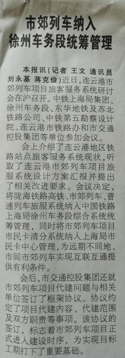 5月9日,连云港市域列车项目旅客服务系统研讨会在沪召开。会议决定,将陇海铁路高铁、市域列车、普速列车旅服系统纳入中国铁路上海局徐州车务段综合系统统筹管理,同时将市域列车项目市民卡清分系统纳入上海局市民卡中心管理,为远期不同地、市间市域列车实现互联互通提供有利条件。