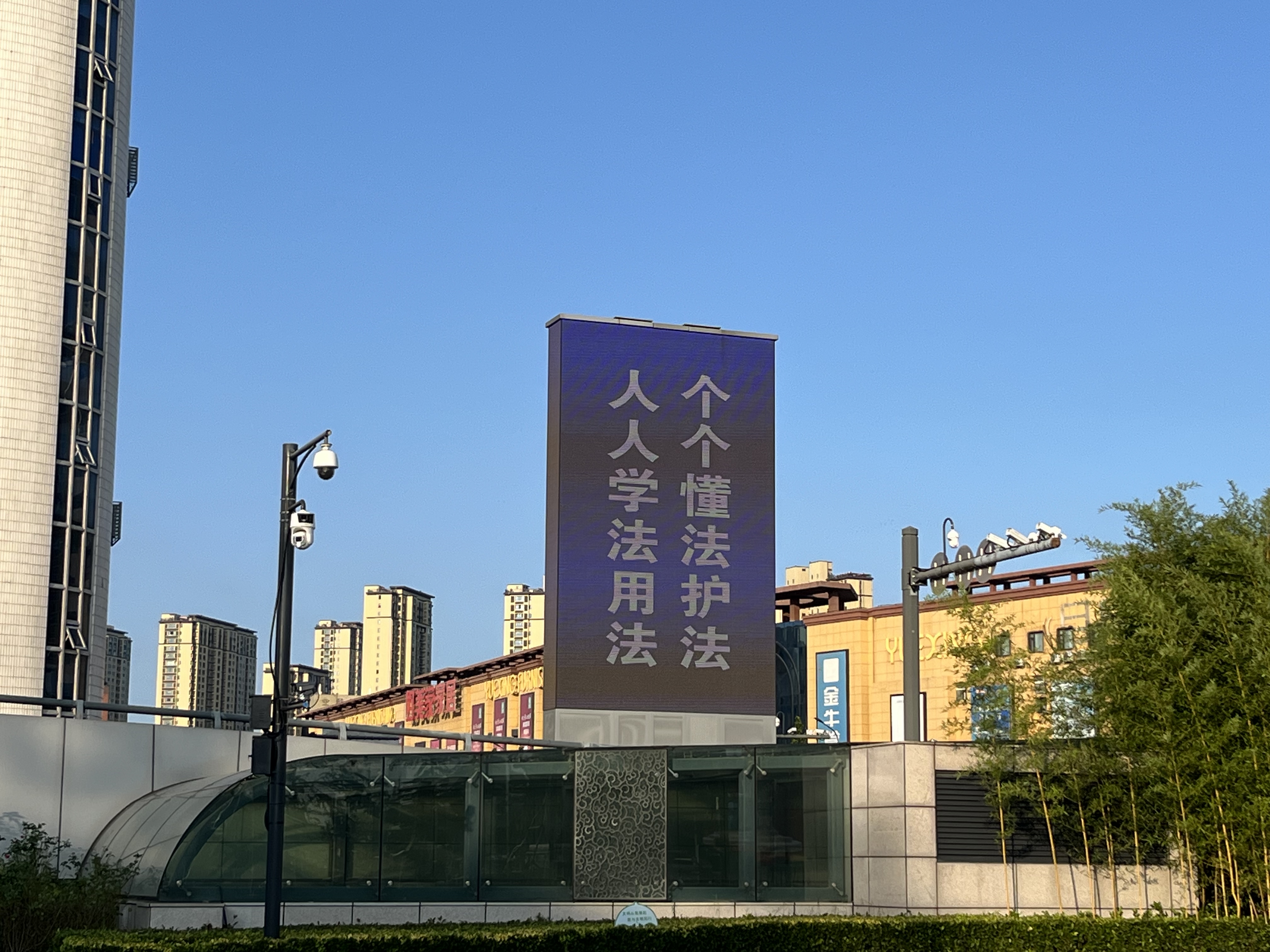 普法宣传月的氛围营造在综合客运枢纽南广场4座户外电子大屏以及海鸥广场东侧LED墙体显示屏开展工作,主要内容有:“文明执法践于行 和谐城管始于心”“树立宪法意识 维护宪法权威”“人人学法用法 个个懂法护法”等。