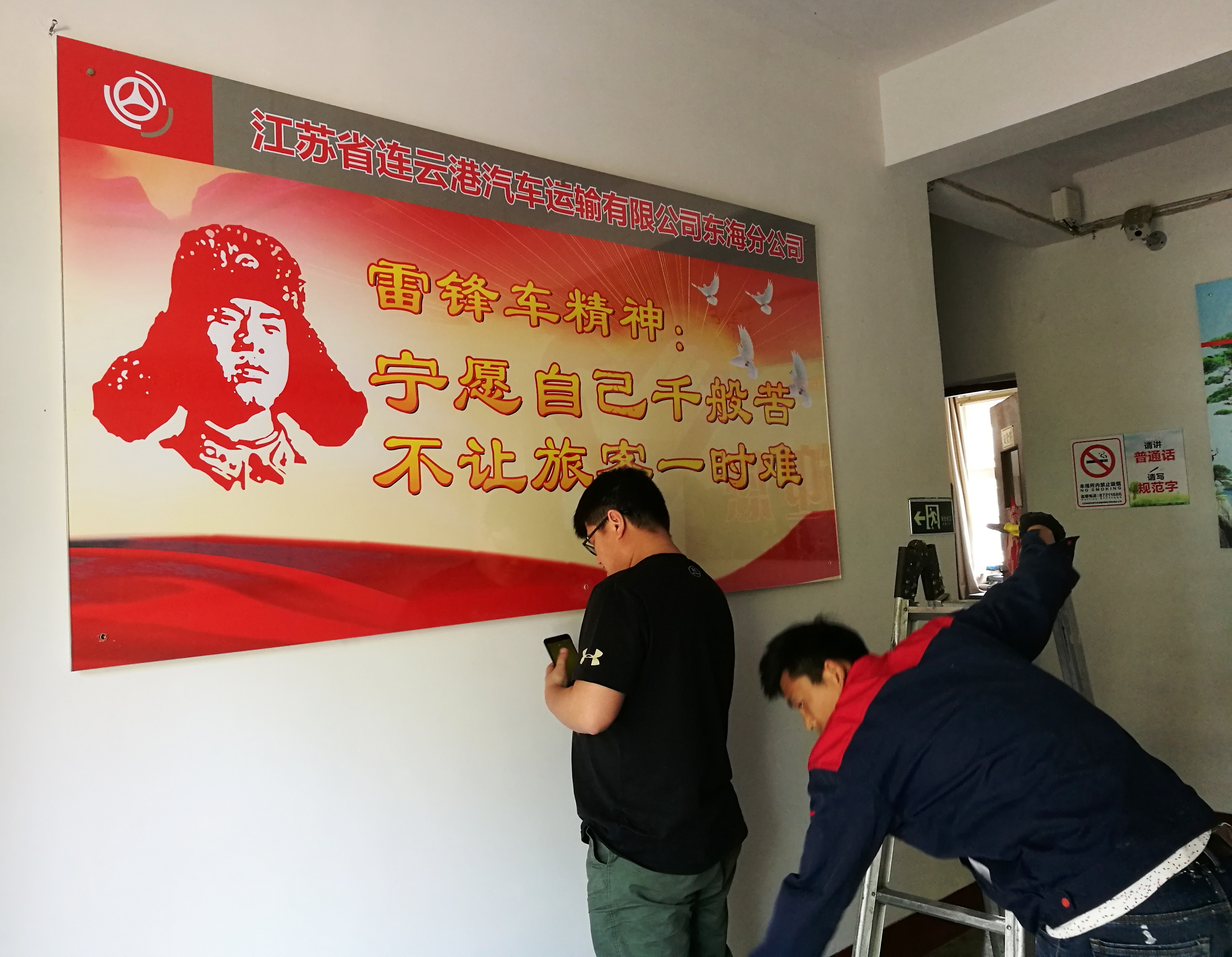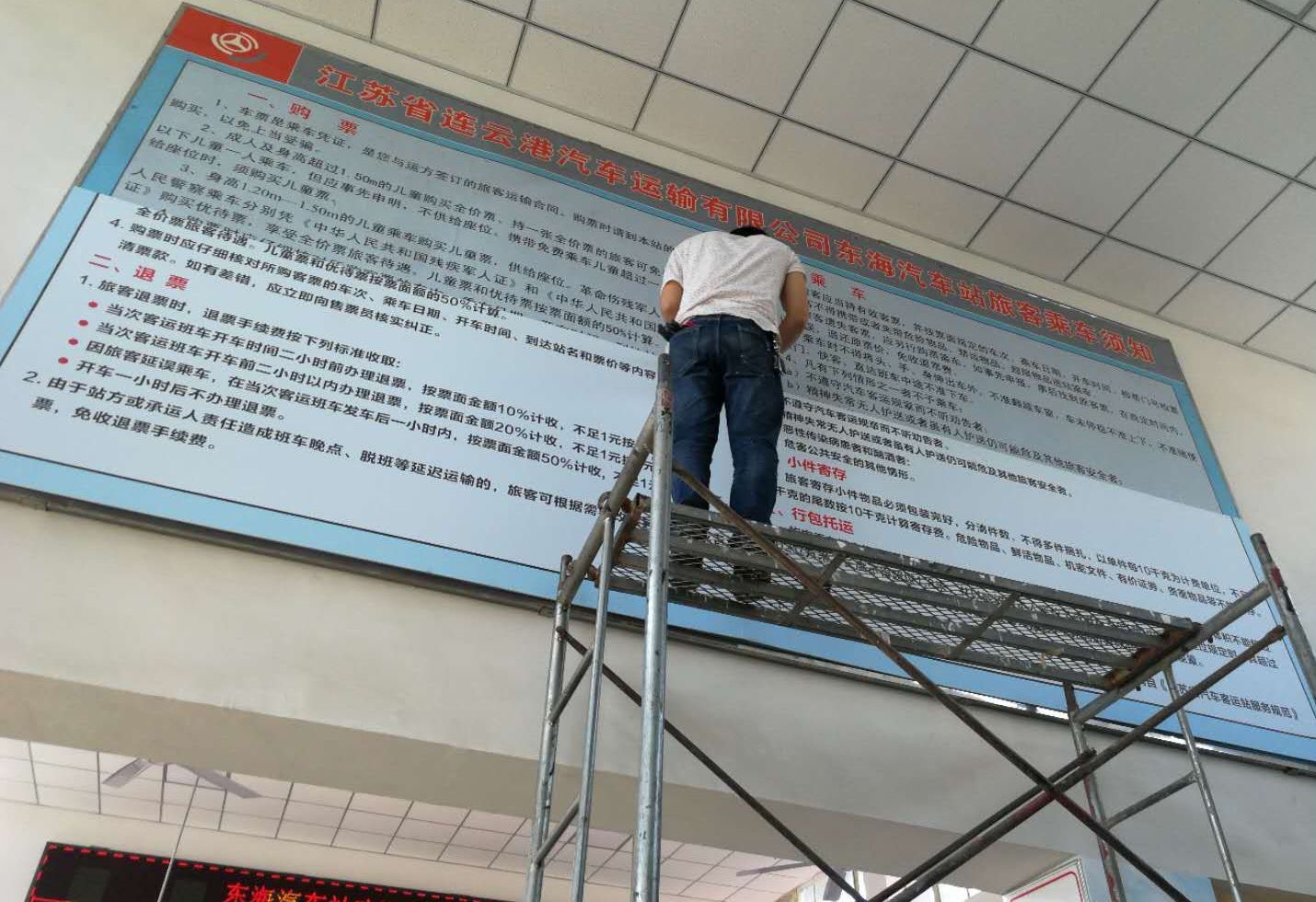 5月9日东海公司认真落实前期市、县语委办用字用语规范督导组对分公司客运站场、候车大厅、售票大厅、办公楼、安检台的指示牌、宣传栏、电子屏幕标语用字用语和检票口工作人员的服务用语、用字规范检查中存在的薄弱环节进行认真的查漏补缺,同时对查出的问题及时整改,并将更正后的标牌、宣传栏等进行更换。