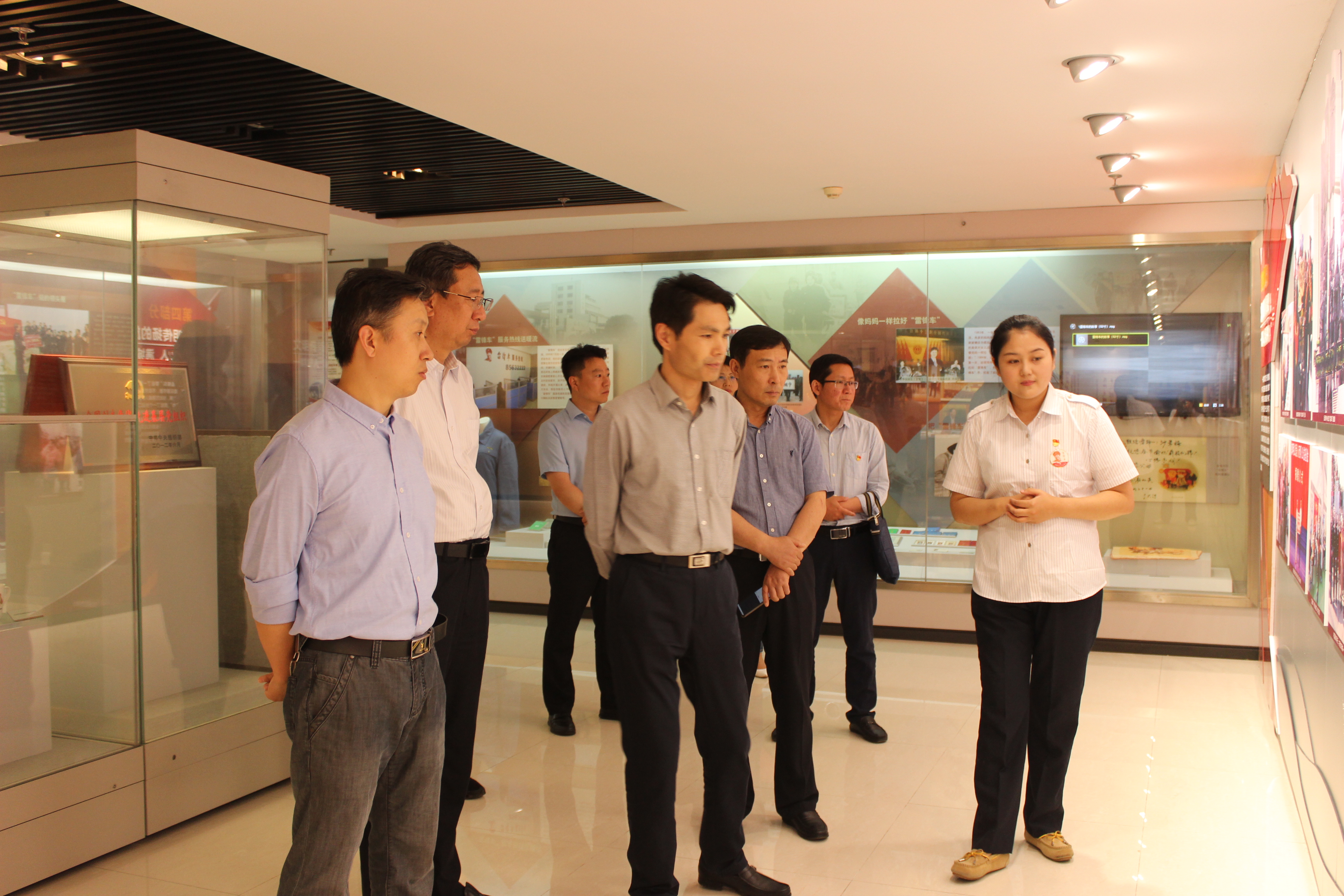 李佺一行首先来到雷锋车党员活动室,现场查看了活动室改造推进情况,听取了相关汇报,随后来到新浦汽车总站二楼,实地调研了雷锋车事迹陈列馆改造主体展厅。在雷锋车手权太琦的介绍下,调研组一行参观了雷锋车事迹陈列馆,询问了整体布局、设计理念及物品陈设等情况,并就展馆改造提出了指导性建议。
