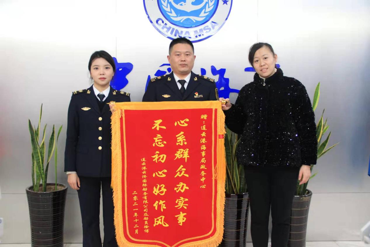 11月28日,物流云济公司接船员徐博委托申办化学品船货物操作高级培训换证业务。当天,业务员在申办中发现船员所持证书化学品船货物操作高级培训科目已过五年时效期,不能进行更新换证。公司及时与船员沟通进一步了解情况,得知由于近年疫情影响,油化一体船业务骤减,船员近几年只能在普通货船工作,导致培训过时效期。了解情况后公司积极联系到连云港海事局政务中心,咨询相关政策。经过多方沟通后,在连云港海事局政务中心葛景勇主任帮助下,陈佳琳科员通过“绿色通道”加急办理,12月27日海员徐博化学品船货物操作高级培训资格证申办完成,为了表示感激之情,云济公司及船员联名送上锦旗。