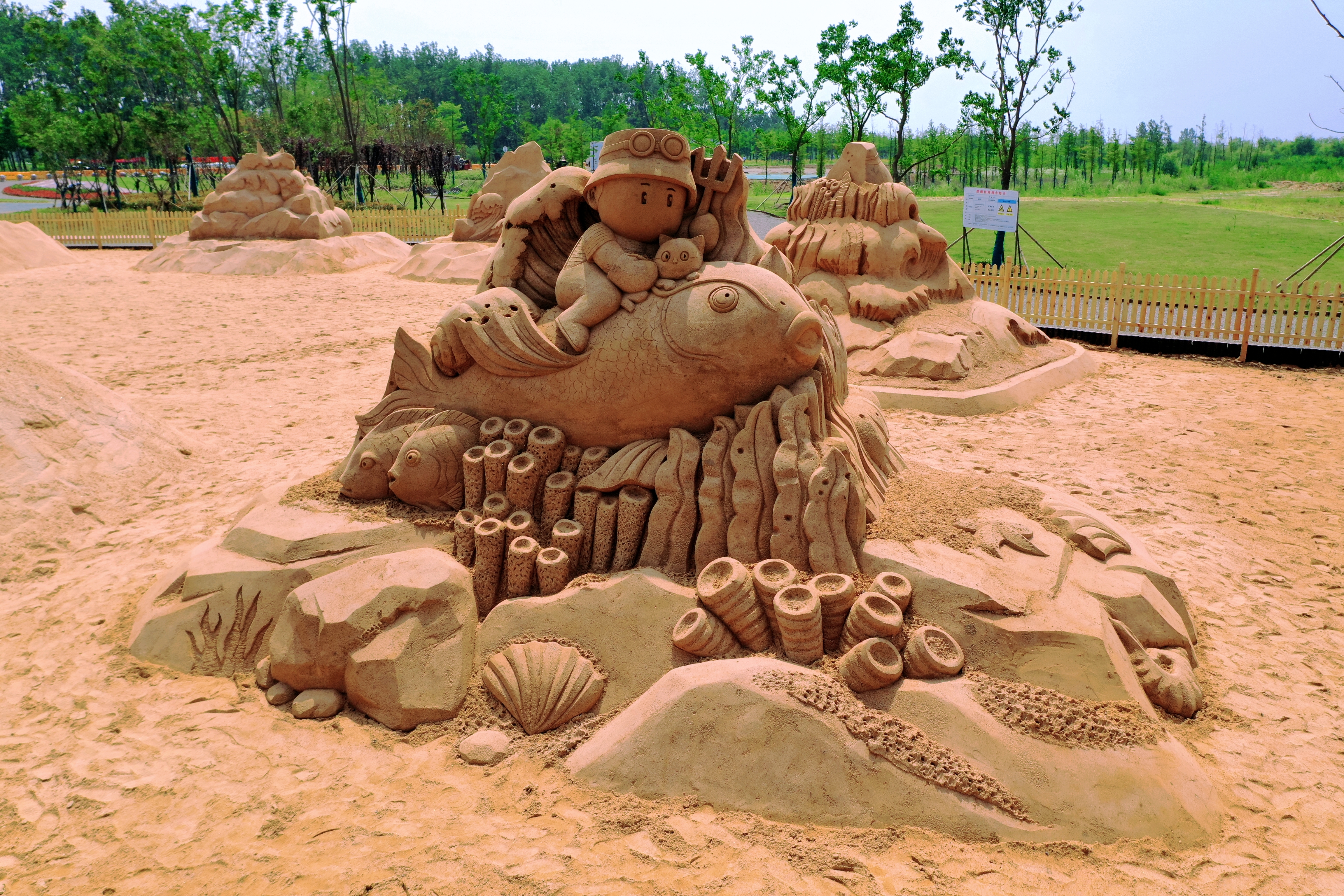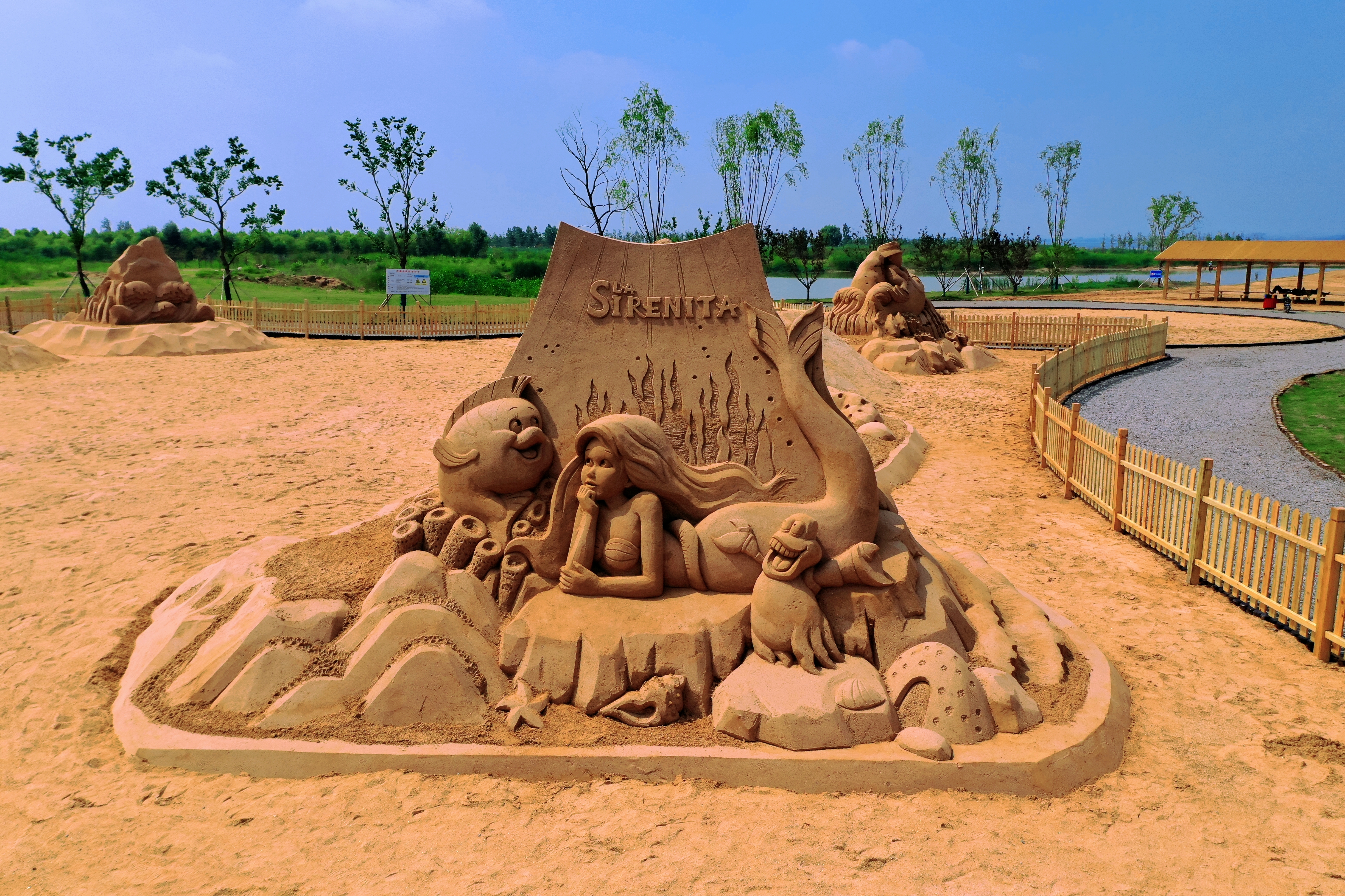 围绕“沙”元素,“趣味沙世界”主题区以沙雕展示为主,七大主题的特色沙雕环绕排列,主沙雕《日月征程》展示了库区群众沧桑六十余载对水库一刻不停的建设和守护,《海陵湖的传说》、《神往之地》、《渔舟芭蕾》、《知鱼之乐》、《小猫钓鱼》、《连年有鱼》等主题将石梁河水库方方面面的文化民俗精华尽数呈现;“迷你亲子水世界”主题区,利用原有滩地的凹地,以生态塘+浅水沙滩的形式设计了一处可观、可玩的亲子互动沙滩区;“房车营地”配有可租借帐篷、小木屋、运动游乐设备等露营设施;“星空露营基地”设置在杉树林中,三面环水,与海陵湖秀丽的湖光相互映衬。“月亮湾”为“黄金沙滩”的主沙滩区,因其月牙的造型而得名,是欣赏海陵湖风光的最佳区域。