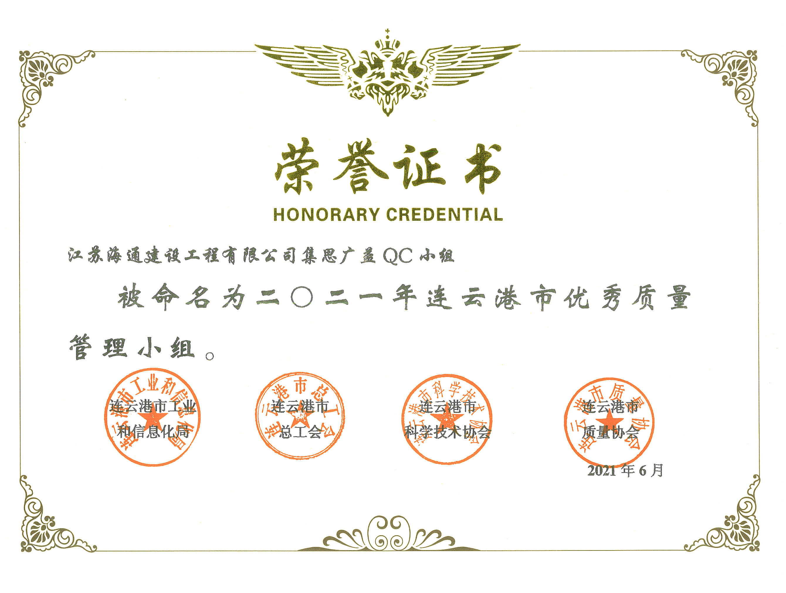 近日,根据市工信局、总工会、科协、质量协会联合下发的《关于表彰2021年连云港市优秀质量 管理小组、质量信得过班组、优秀企业、卓越领导者、优秀推进者的通知(连工信发〔2021〕101号)》文件获悉,江苏海建公司集思广益QC小组、只争朝夕QC小组和风控法律服务QC小组被命名为2021年连云港市优秀质量管理小组。