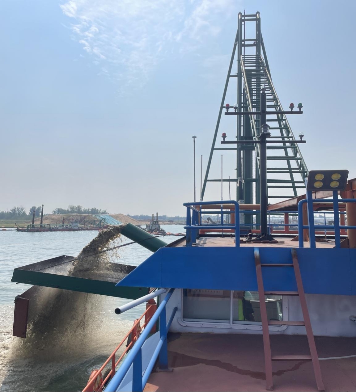 海陵湖采006号吸泥船长34.8米、宽9米、吃水深度2.8米,最大毛砂产量200吨/小时,投入使用后将进一步提高采洗砂项目生产能力。