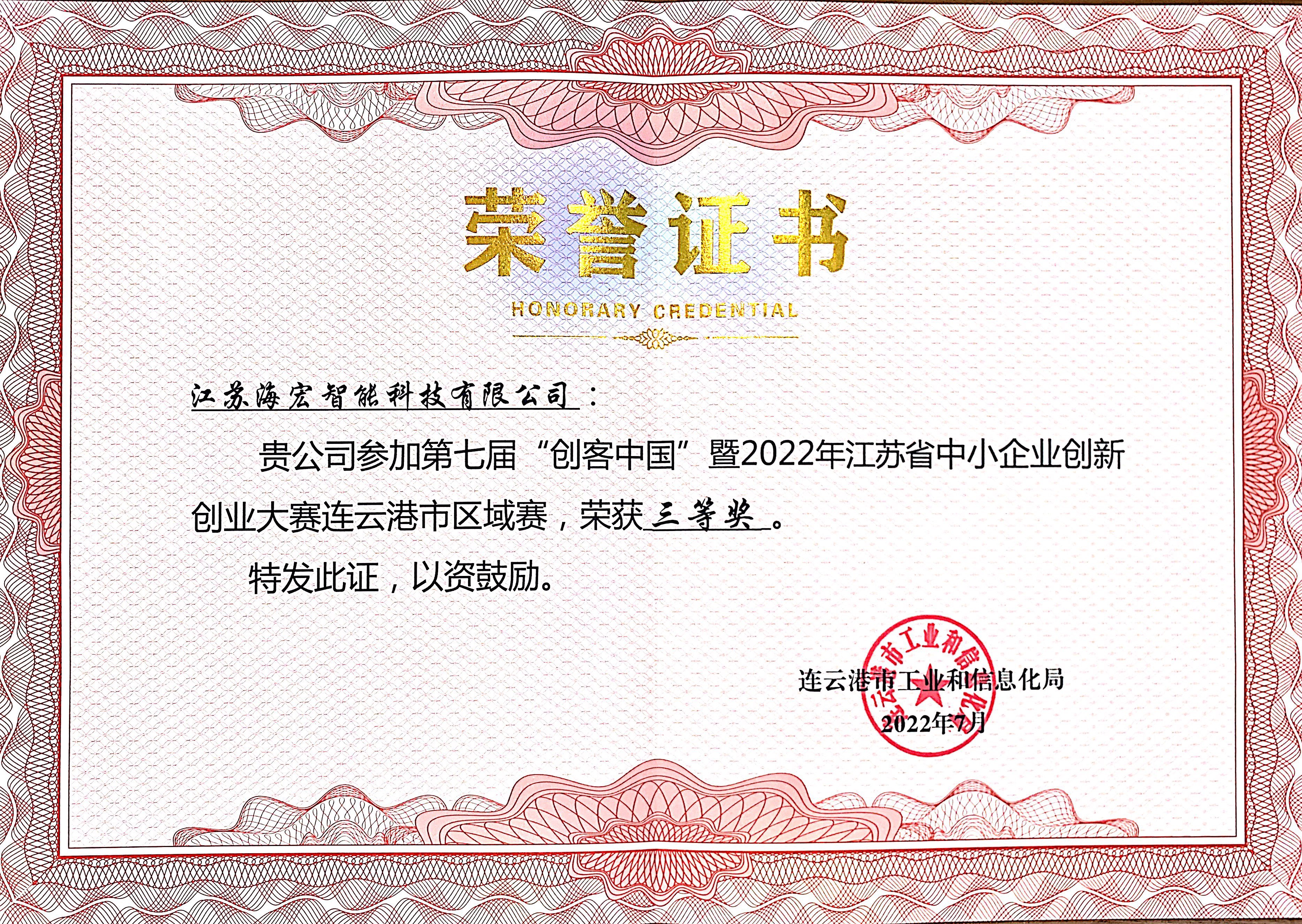 本次活动由连云港市工业和信息化局牵头,旨在深入贯彻落实党中央、国务院和省委省政府支持中小企业创新创业能力和专业化水平,推动中小企业高质量发展。活动共收获来自各地多行业创新创业案例百余项,经过报名、比赛等环节层层角逐,海宏科技“MSO高速凹版直印印花机”最终荣获三等奖。