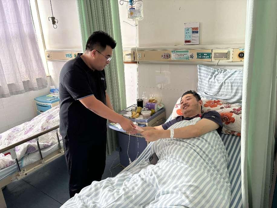 828明茂公司副总经理刘东一行带着公司的关爱与嘱托,到中医院看望生病职工卢洋,把慰问送到他的手中,带去了明茂公司的关心与关爱