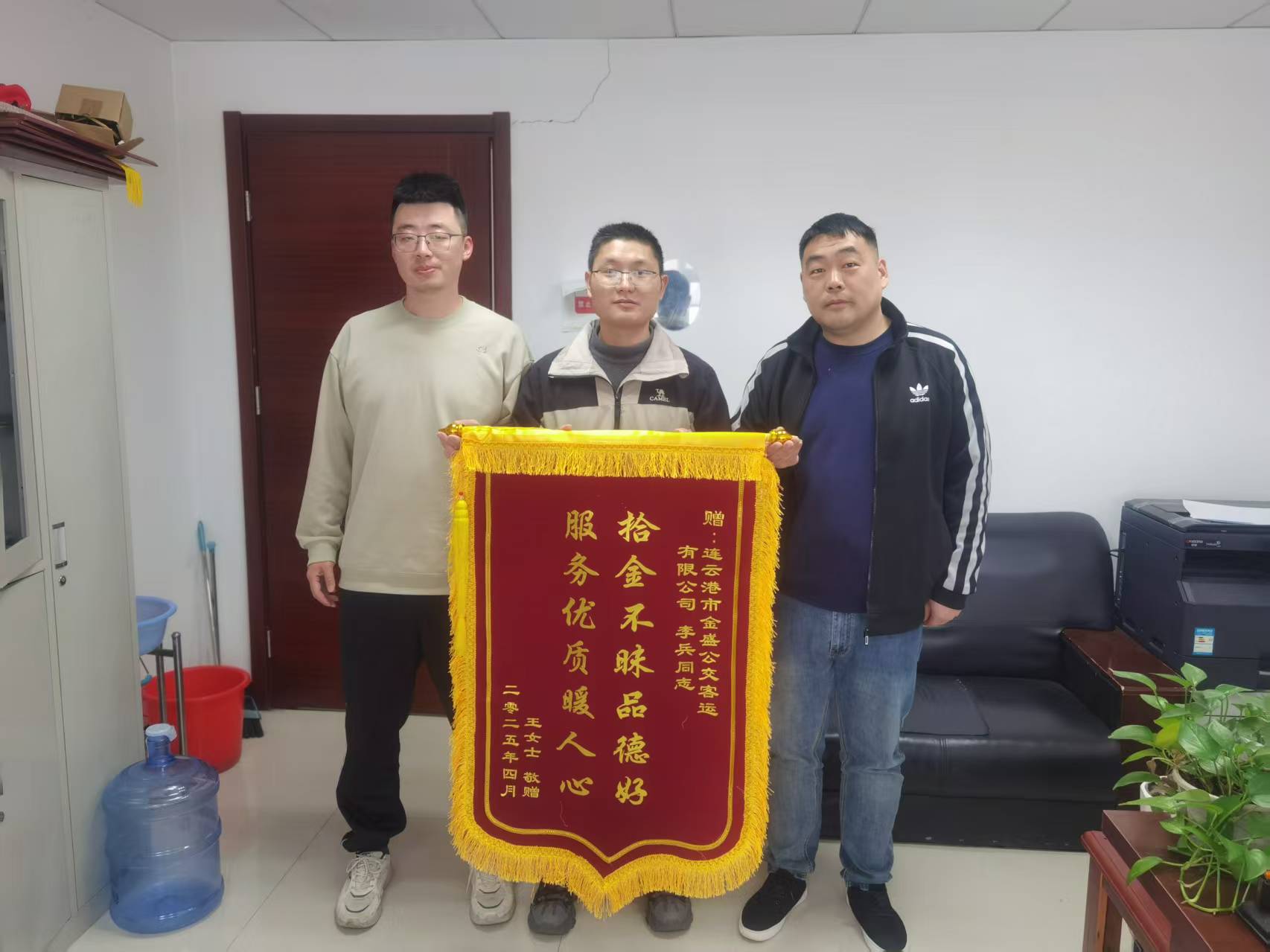 4月23日上午,市民王女士委托丈夫,将一面写有“拾金不昧品德好 服务优质暖人心”的锦旗送到了连云港市金盛公交客运有限公司,以此感谢602路公交车驾驶员李兵师傅。