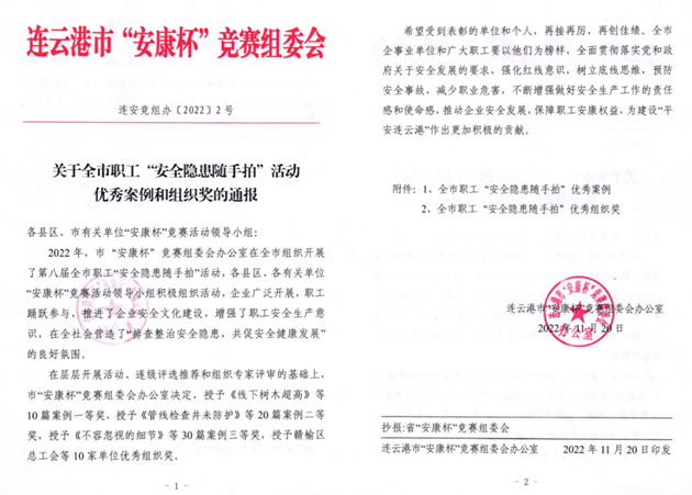 经过市“安康杯”竞赛组委会专家评审,华体会app最新版下载,华体会(中国)权属海建公司龚岩拍摄的《施工现场安全防护隐患》荣获一等奖;海建公司朱勇拍摄的《洗沙设备传动装置无防护》、丰达公司胡可阳拍摄的《道路交通标志牌倾斜》、公交华体会app最新版下载,华体会(中国)徐辛拍摄的《“平躺”的易爆品》、交通华体会app最新版下载,华体会(中国)赵州拍摄的《爬梯无护笼》荣获二等奖;海建公司徐超拍摄的《出砂口缺少防护》、张杰拍摄的《围堰内通行爬梯不符合要求》、汽车公司郭磊拍摄的《消防栓水阀无法开启》荣获三等奖,华体会app最新版下载,华体会(中国)荣获优秀组织奖。