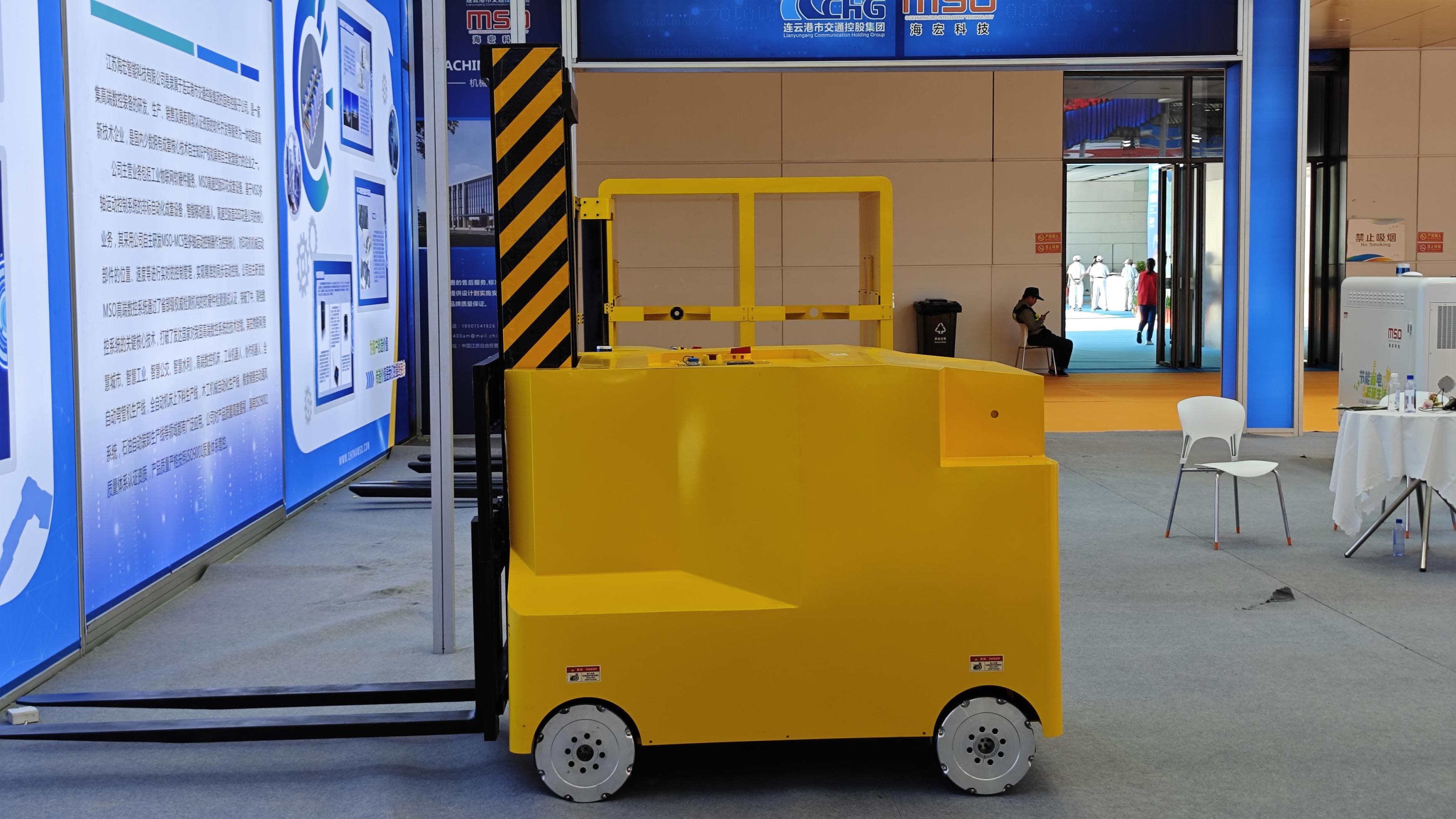 海宏科技现场演示了“AMR全向移动智能叉车”,该产品采用公司自主研发的MSO-MC3型号多轴运动控制系统作为控制核心,精准控制多轴间的差速运转,通过搭载的麦克纳姆轮实现原地360°转向移动,横向平移,斜行漂移,机身配置激光雷达,防碰撞预警雷达,卫星定位等传感器,可实现场内自主导航,自主路径规划,自动驾驶,赋予了智能叉车在有限的空间内闪转腾挪,进退有度的傲人本领。AMR全向移动智能叉车可广泛应用于智能制造,智能仓储,智慧物流等领域,实现机器代人,标准化自动化搬运,全面赋能企业智慧化转型和数字化改造。