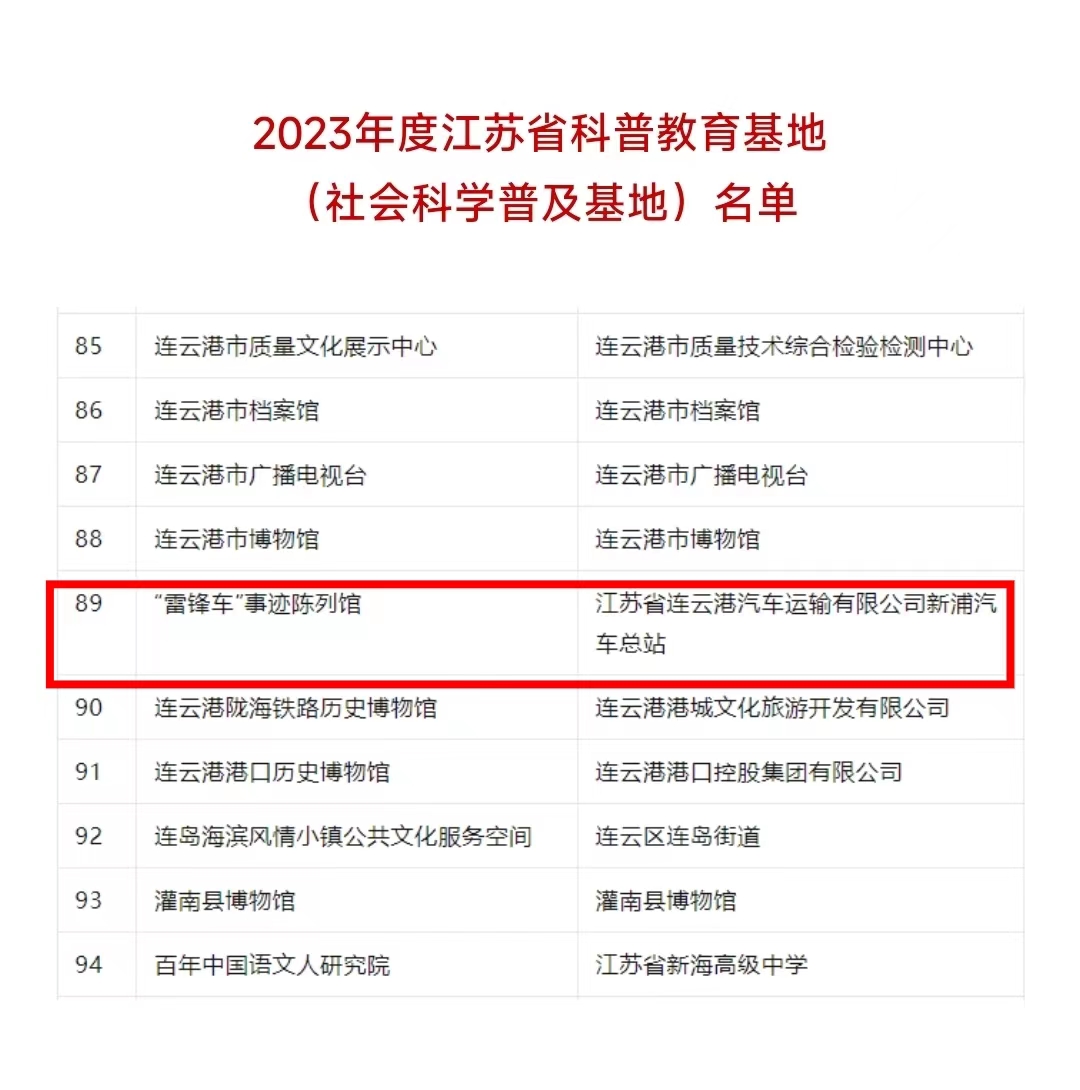 日前,由江苏省科协、省社科联、省科技厅、省教育厅联合开展的2023年度江苏省科普教育基地认定工作结束,“雷锋车”事迹陈列馆成功入选。
