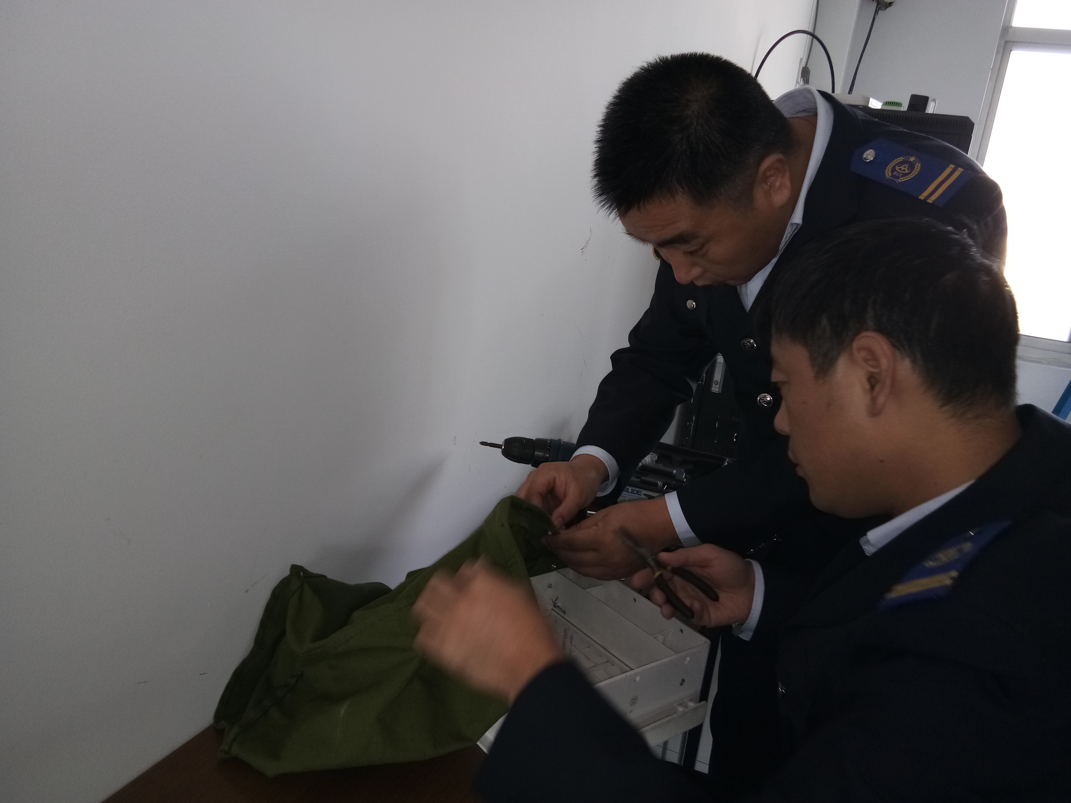 11月1日上午,运营信息科又接到几个坏的投币箱钱袋,运营信息科科长霍昌如凭借以往经验,开始了投币箱钱袋维修工作,首先他用手枪钻将投币箱钱袋四周的铆钉打通,取出四周固定钱袋的铆钉;接着将钱袋从箱体上进行剥离,此时要特别注意挂在布袋四周的铆钉铁削刮伤手;其次拆除钱袋箱体内部盖板部分,取出钱袋箱体内部防盗挡板插销,取出挡板及弹簧,并对弹簧进行修复、调整;最后修复后对钱袋箱体内拆卸下的物品进行复位,同时插入投币箱插板,并进行调试,调试完成后,对投币箱钱袋进行整体复位,使用铆钉枪将钱袋与箱体进行固定,直到投币箱钱袋完整,完成后对整体进行测试,确保投币箱正常使用。