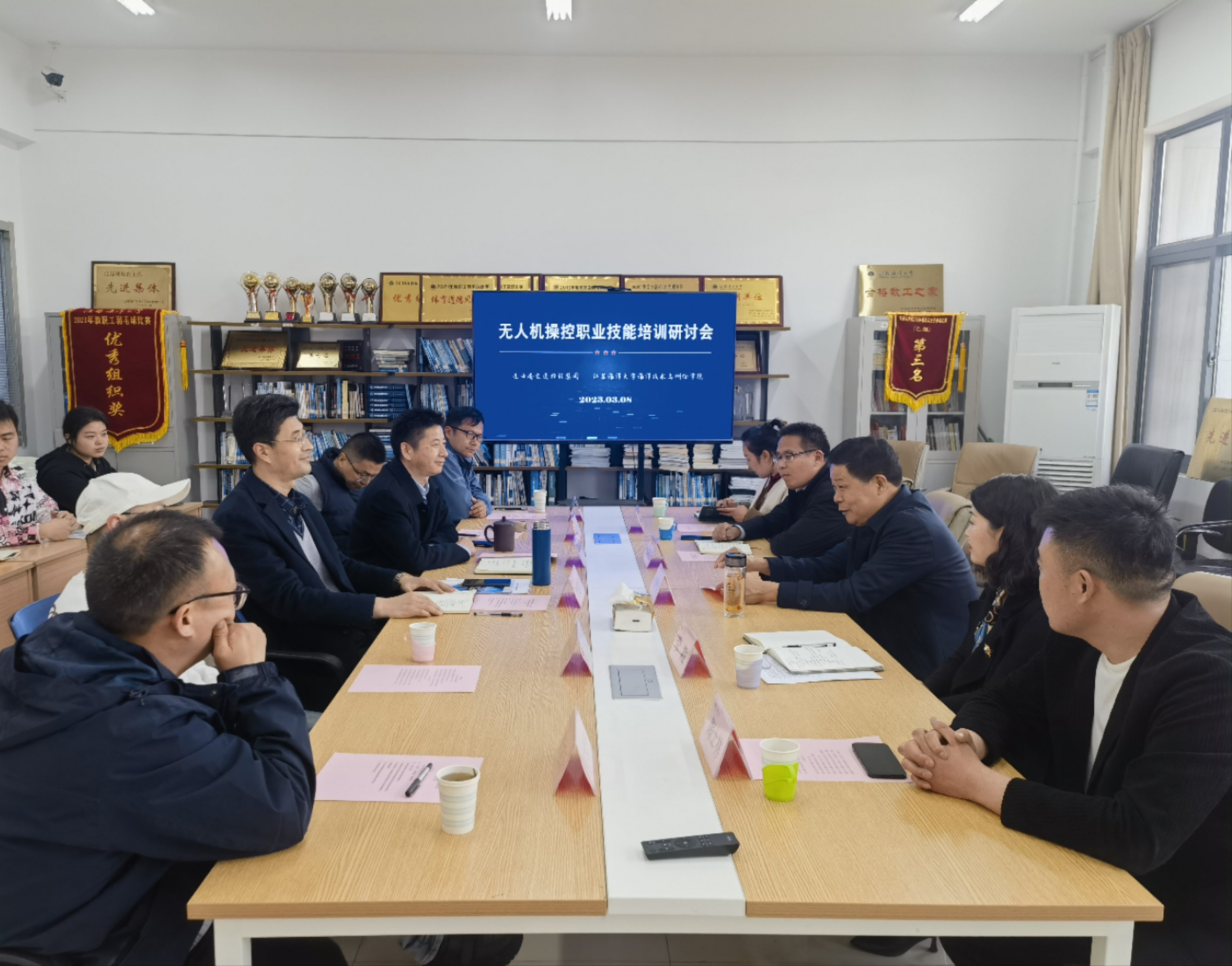 3月8日,交培公司赴江苏海洋大学与海洋技术测绘学院共同开展无人机操控职业技能培训研讨会,交控华体会app最新版下载,华体会(中国)副总经理李树军应邀出席,海洋技术测绘学院院长孙佳龙、学院副书记田扬启及相关处室负责人,交培公司主要负责人李霞及分管负责人、无人机业务负责人参加培训交流研讨会。会议由田扬启主持。