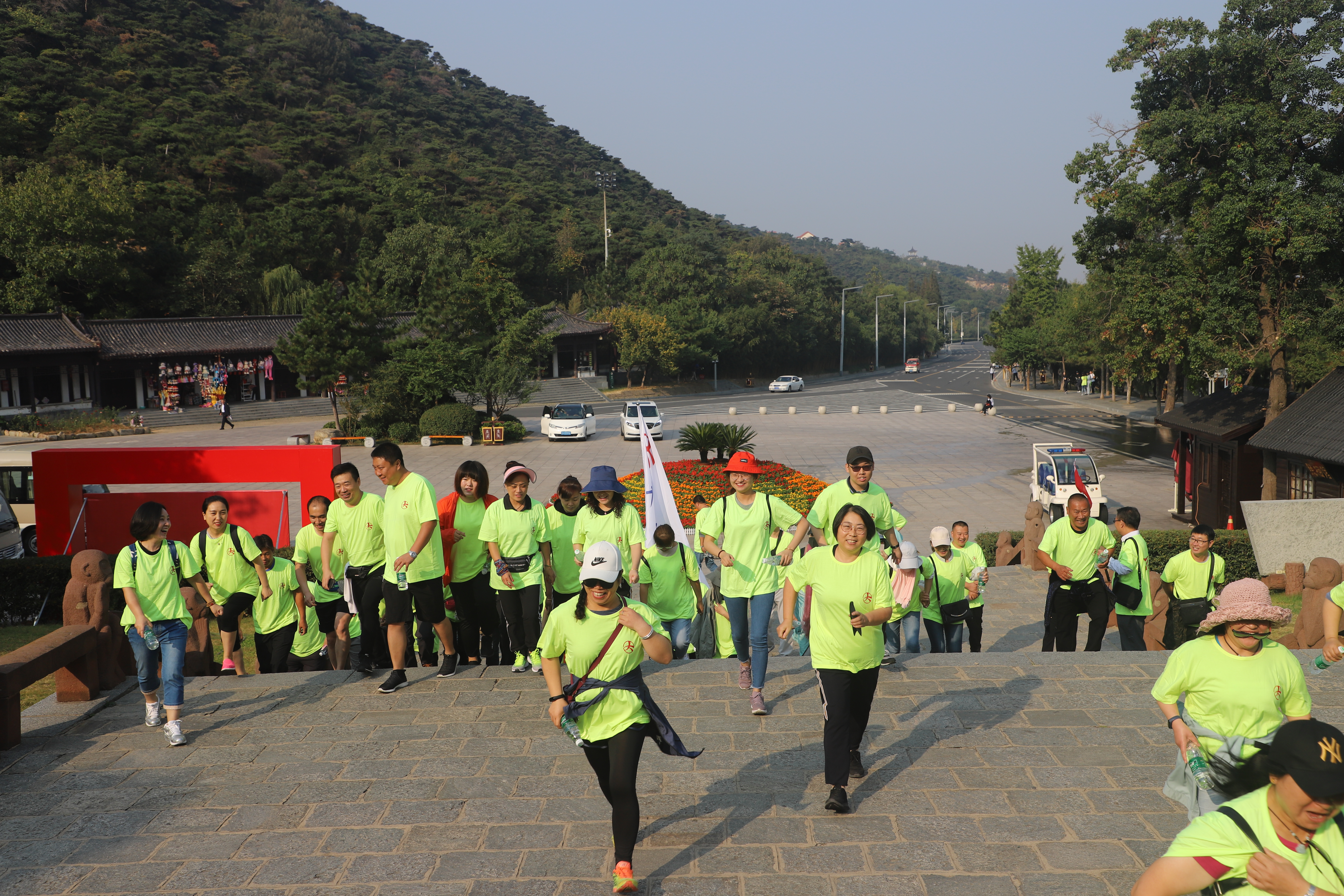 途中,大家兴高采烈,谈笑风生,时而你追我赶、奋力攀爬,时而互相鼓励、携手并进,整个登山过程洋溢着温馨、愉悦的氛围,大家享受着登山的乐趣,向终点进发。从花果山山门到九龙桥,最考验大家体力的是十八盘,十八盘位于花果山腰部的竹节岭上,349级石阶层层相迭,巧相搭构,通向岭端,随着高度的不断攀升,加之蜿蜒崎岖的山路起伏跌宕,不少职工累的气喘吁吁,大汗淋漓,但是大家仍然兴致盎然,朝着目标,不停地向上攀登。