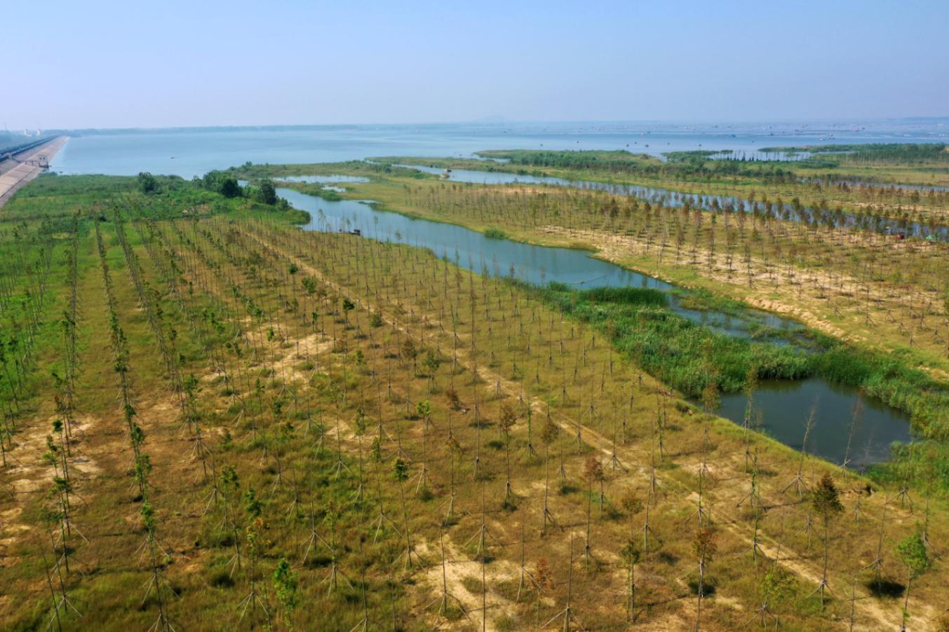 石梁河水库生态修复工程农村生产道路全长55公里,道路绿化方案结合水库周边自然环境特性,以色叶植物为基调,全面覆盖库区,形成层林浸染的视觉效果,营造自然、生态、乡野的滨水景观生态走廊。年内计划在已完成的18公里道路两侧全面开展绿化栽植,共种植杉树、湿地松、紫叶李等各类绿化树种1万余株,合计复绿面积将达到23万平方米。工程完工后,将大大改善石梁河库区生态环境和景观面貌,改善人居环境,实现“水、林、田、村相互交融,人与自然和谐共生”的人文景观。