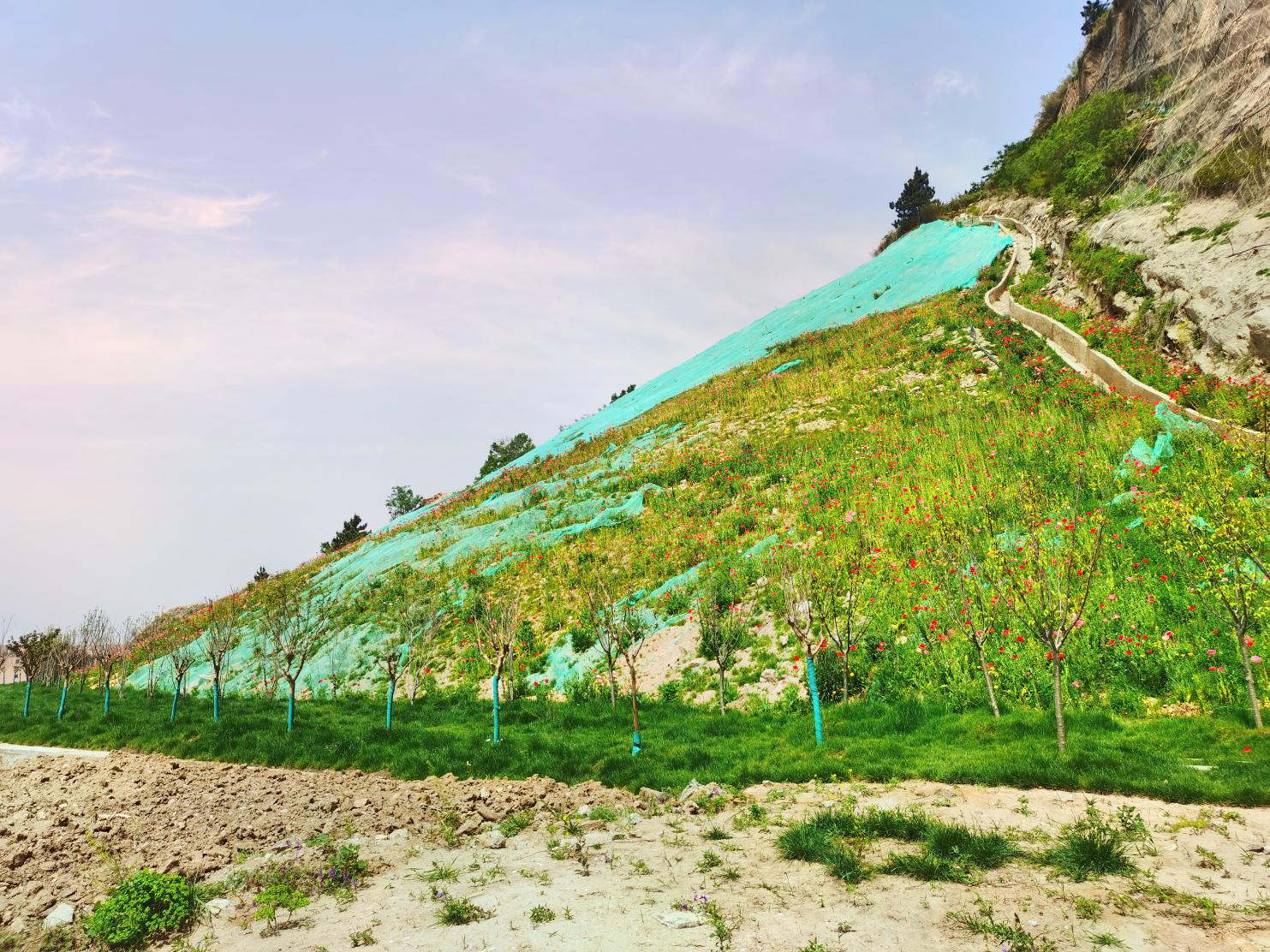 初夏将至,花果山国家地质公园前云台山北麓、云台线东侧的小村北山宕口,遍山绿色,郁郁葱葱,漫野花香。历经半年的改造,一改坡面岩体破碎、危岩悬空突出、植被几无覆盖的面貌,换上新装,整个山体修复治理基本达到恢复效果。
