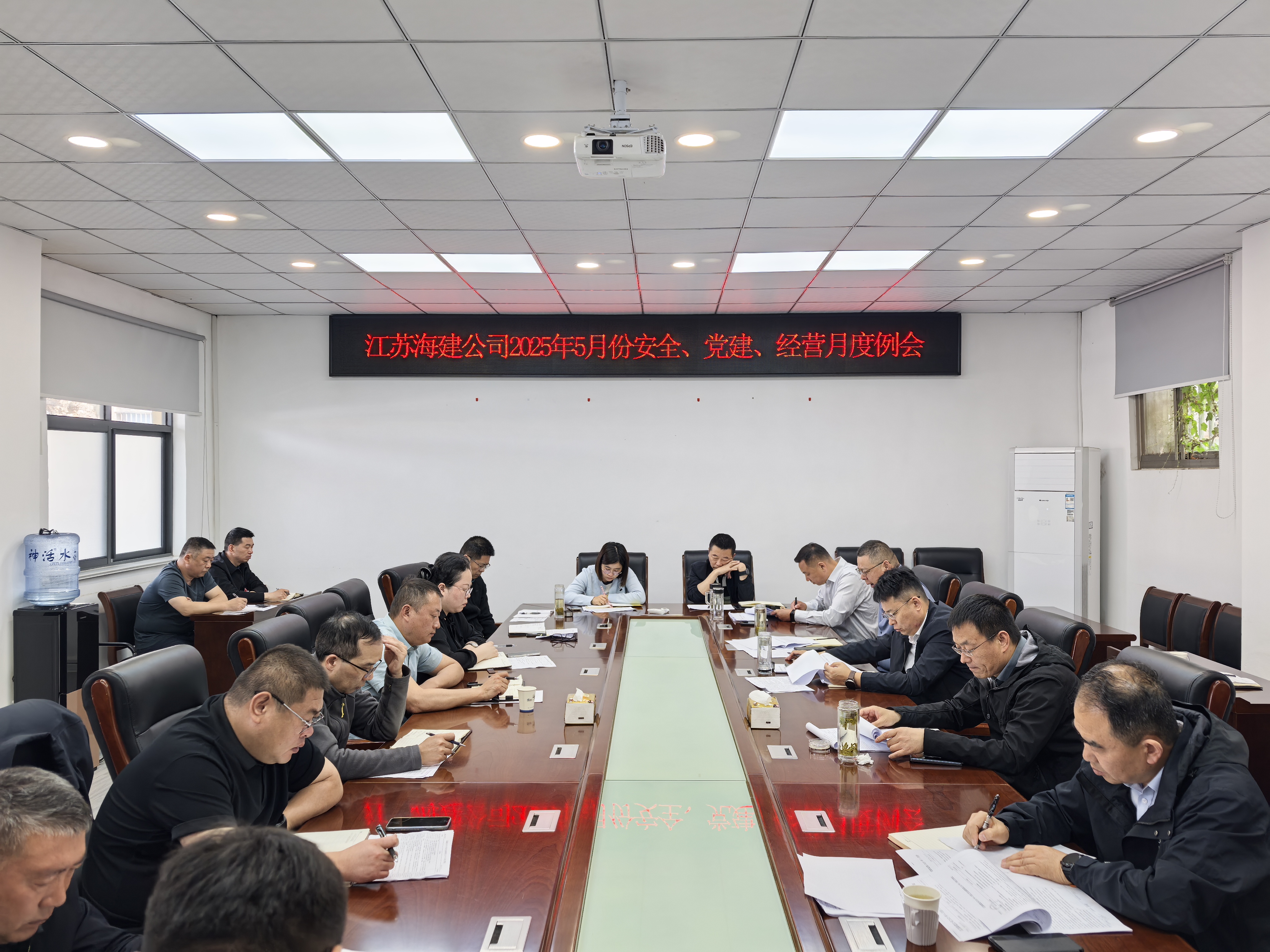 5月6日,海建公司召开5月份安全、党建、经营月度例会,全面总结阶段工作成效,部署下一阶段重要任务。公司领导班子成员,各单位、各部门主要负责人共计20人参加会议,会议由总经理徐其翔主持。