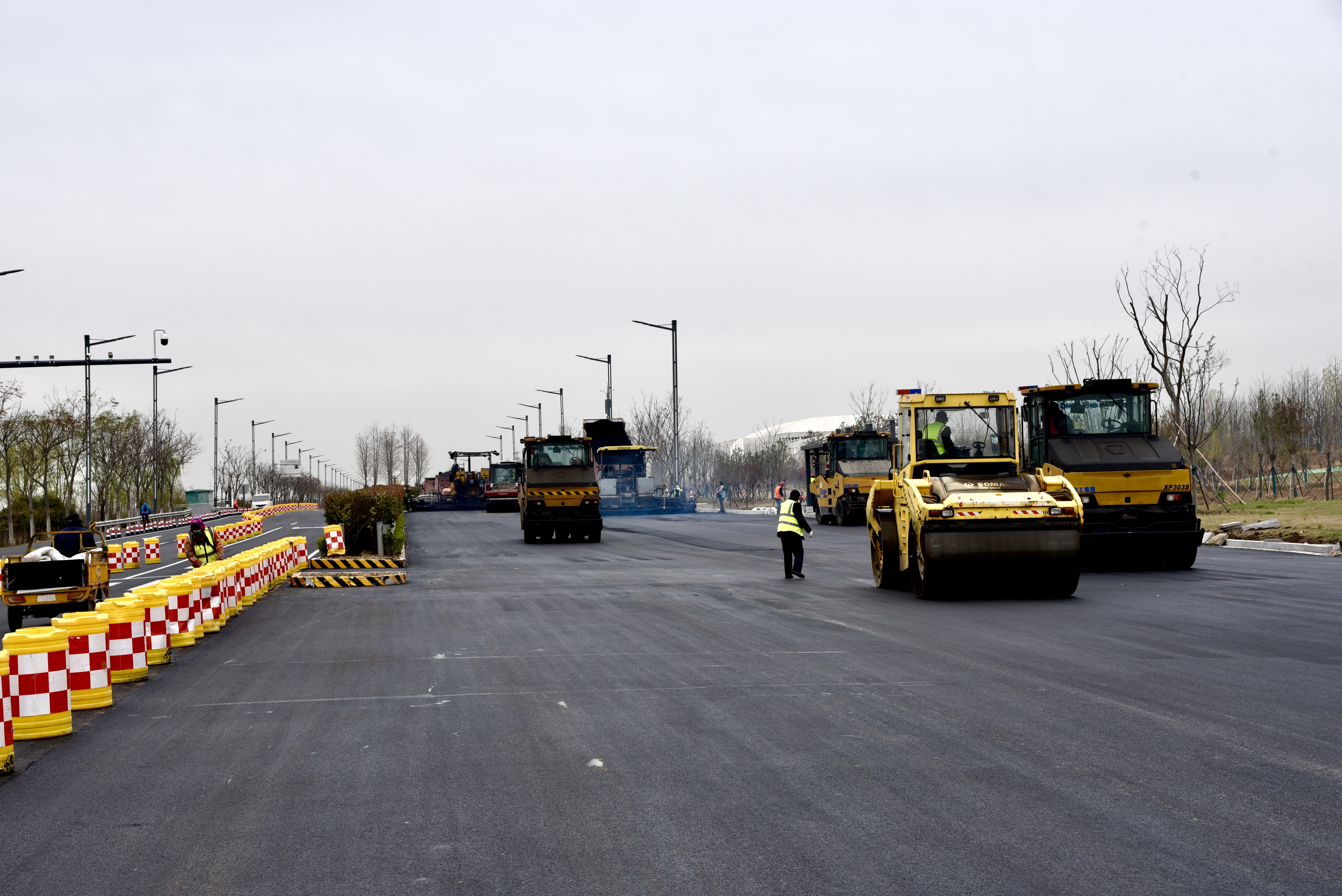 3月24日,在徐新公路(花果山大道-烧香河大桥北桥头段)项目施工现场,随着路面摊铺机、压路机等机械轰鸣声渐息,沥青混凝土路面顺利铺筑完成。